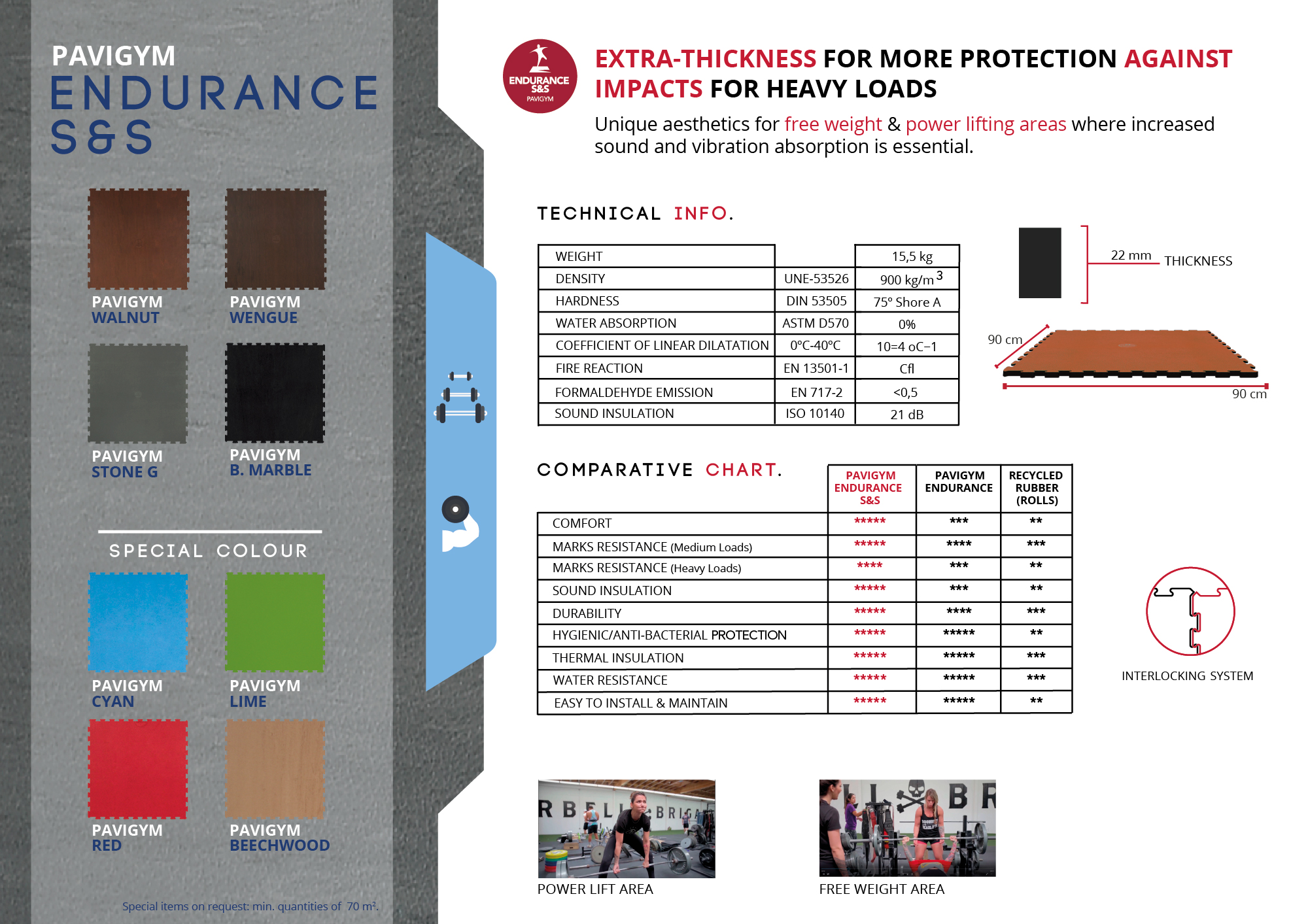 Pavigym endurance gym flooring is composed of virgin rubber. This ensures that the flooring is capable of dealing with an extensive list of common problems that occur with standard gym floors. Due to the composition of raw materials pavigym tiles are;